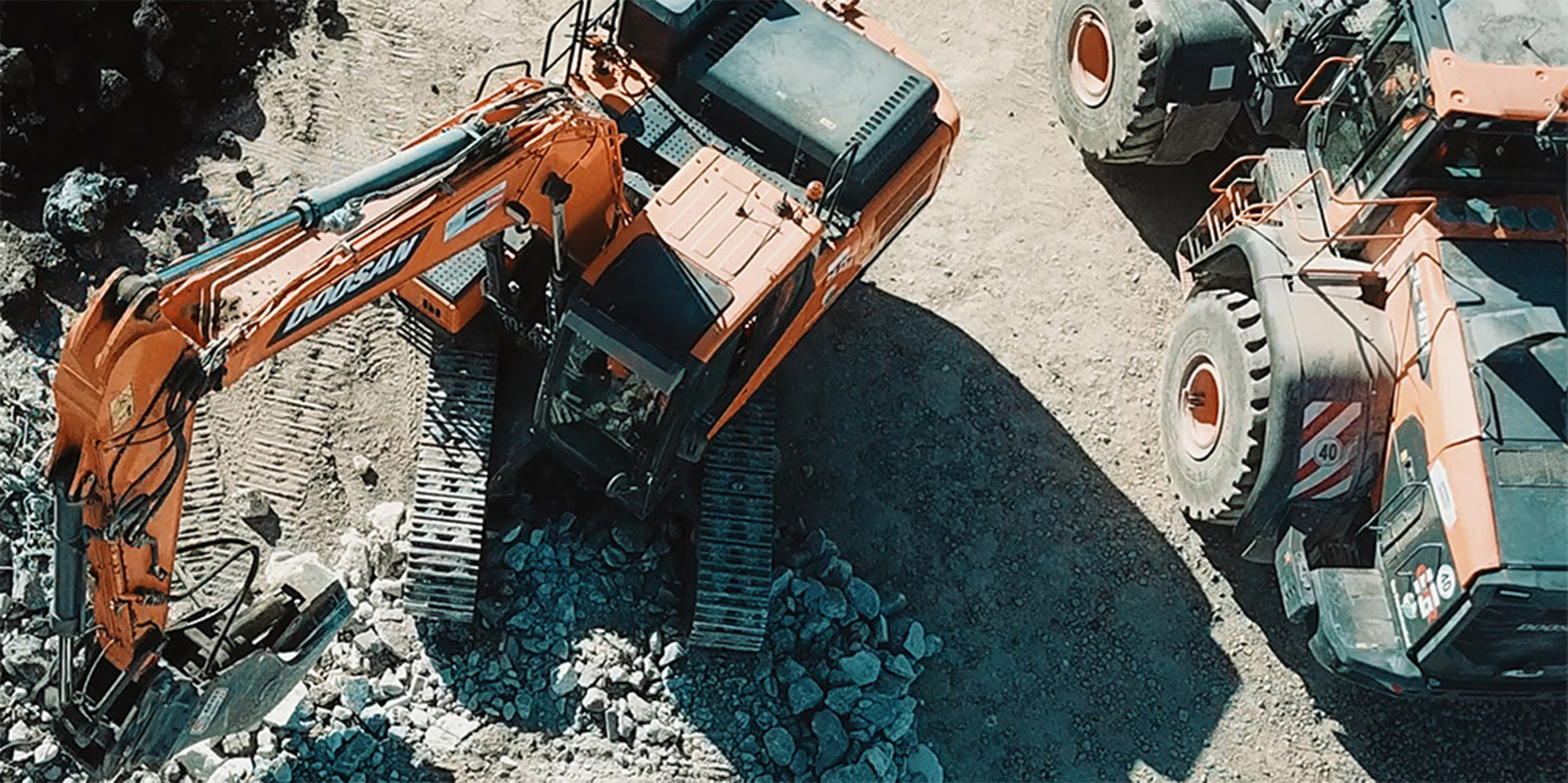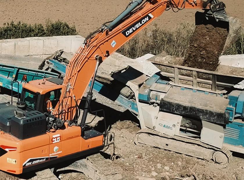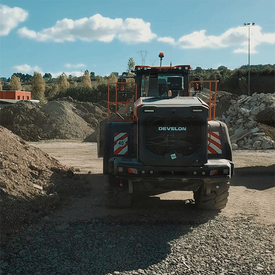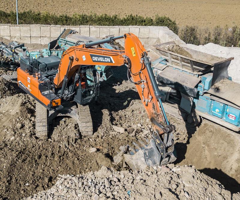 Sul sito di Misano, la totalità dei mezzi d’opera ha la livrea arancione di Develon; una scelta ponderata da parte dei Eco-Frantumazioni, basata su due fattori principali, ben sottolineati da Montebelli : “Al momento di aggiornare il nostro parco macchine che affianca i vagli e i frantoi, abbiamo valutato numerosi produttori di prima fascia e ci siamo orientati su Develon essenzialmente per due ordini di motivi”.